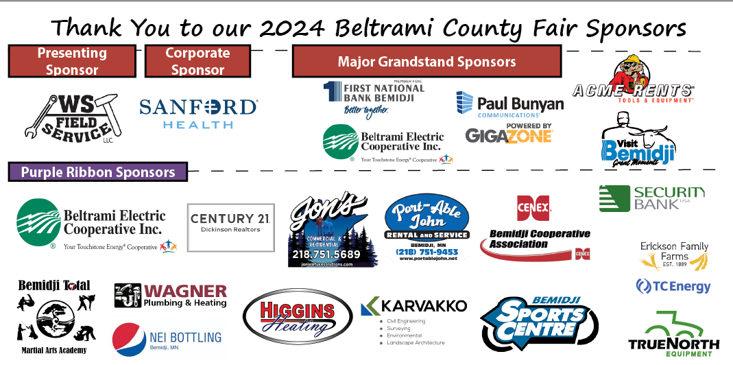 We want to thank all our sponsors for 2024. We are able to offer a wide variety of entertainment and activities because of our sponsors generous donations. Please support these local businesses and thank them for their support to the Beltrami County Fair.